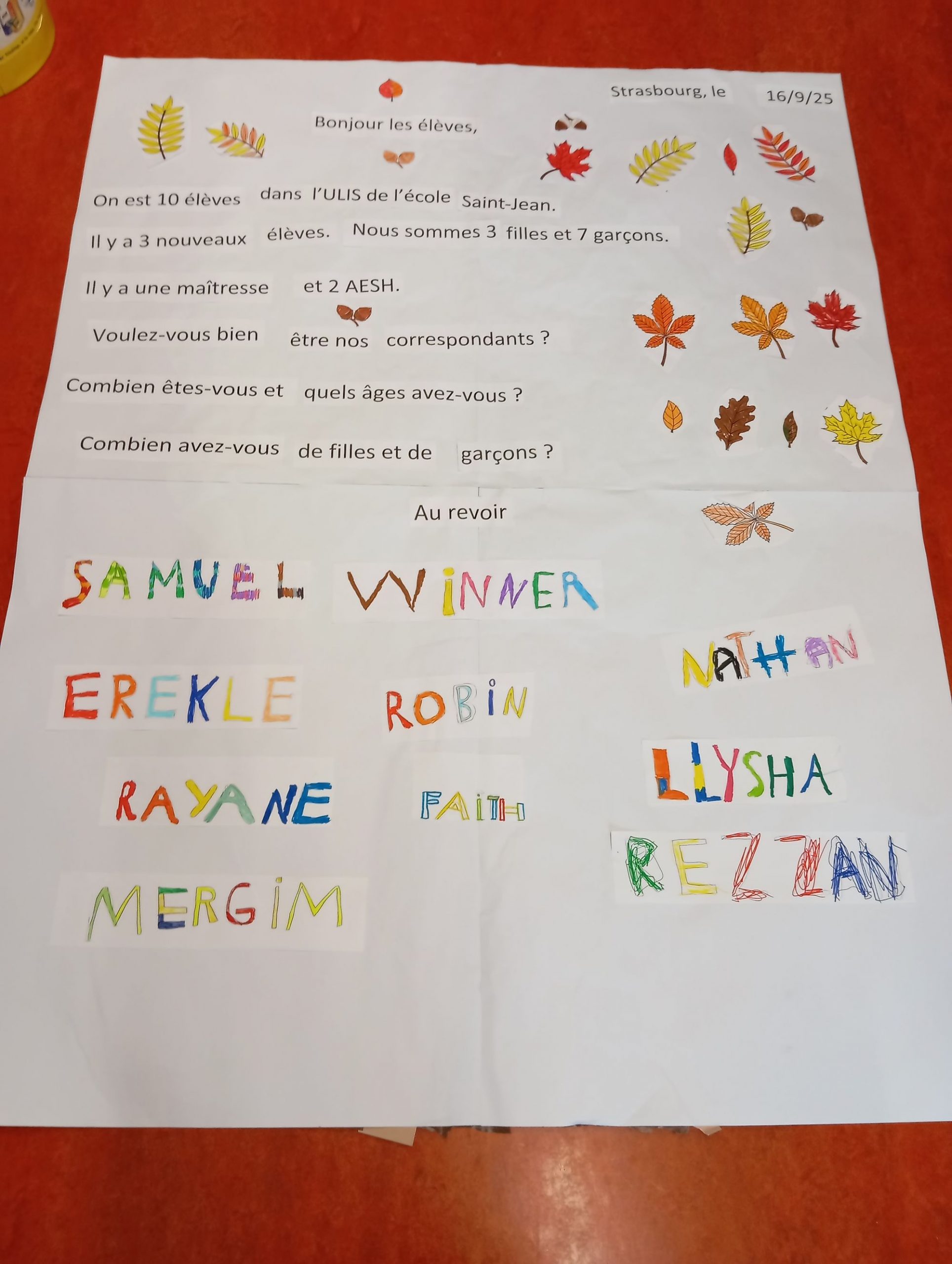 Les élèves de l’ULIS de l’Ecole élémentaire Saint-Jean ont fini leur grande lettre pour leurs correspondants de l’ULIS de l’Ecole Schoepflin. Ils ont réalisé un grand arbre d’automne.